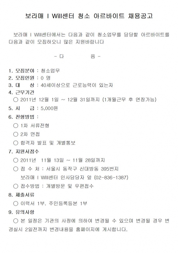 | º¸¶ó¸Å I Will¼¾ÅÍ Ã»¼Ò¾Æ¸£¹ÙÀÌÆ® ä¿ë °ø°í | |