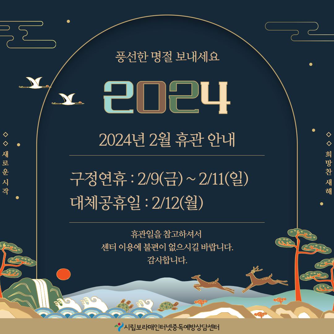 | ½Ã¸³º¸¶ó¸ÅÀÎÅͳÝÁßµ¶¿¹¹æ»ó´ã¼¾ÅÍ 2024³â 2¿ù ¼³ ¸íÀý ÈÞ°ü ¾È³» | |