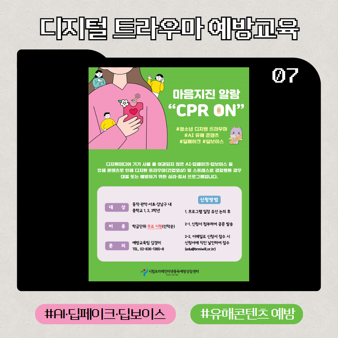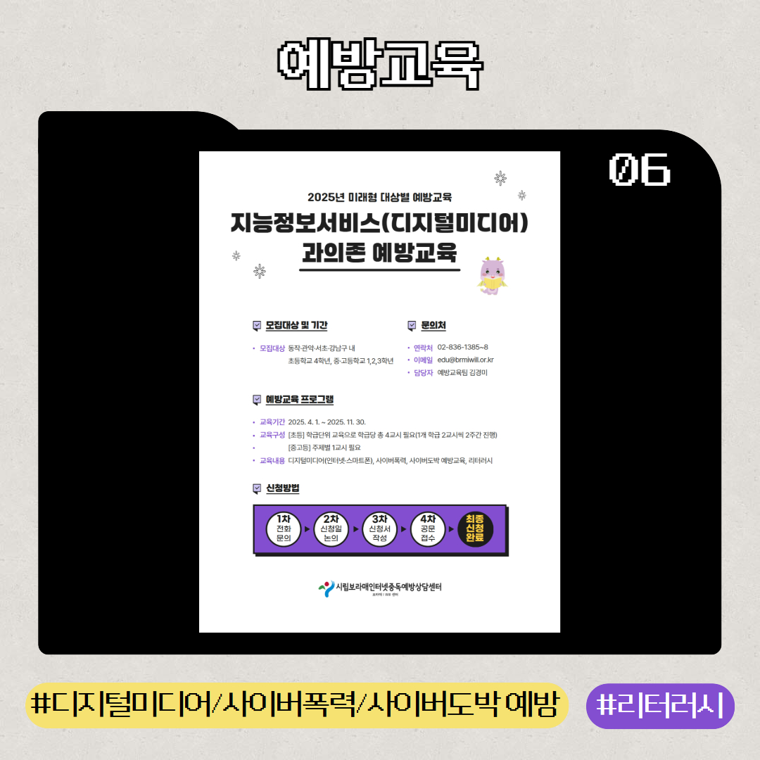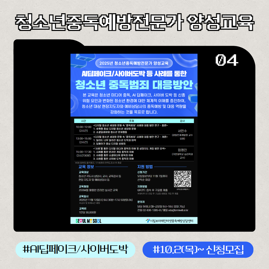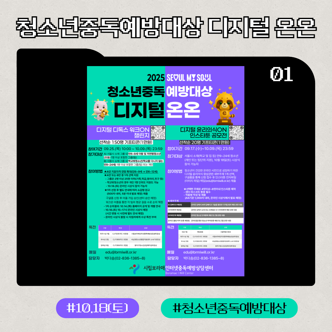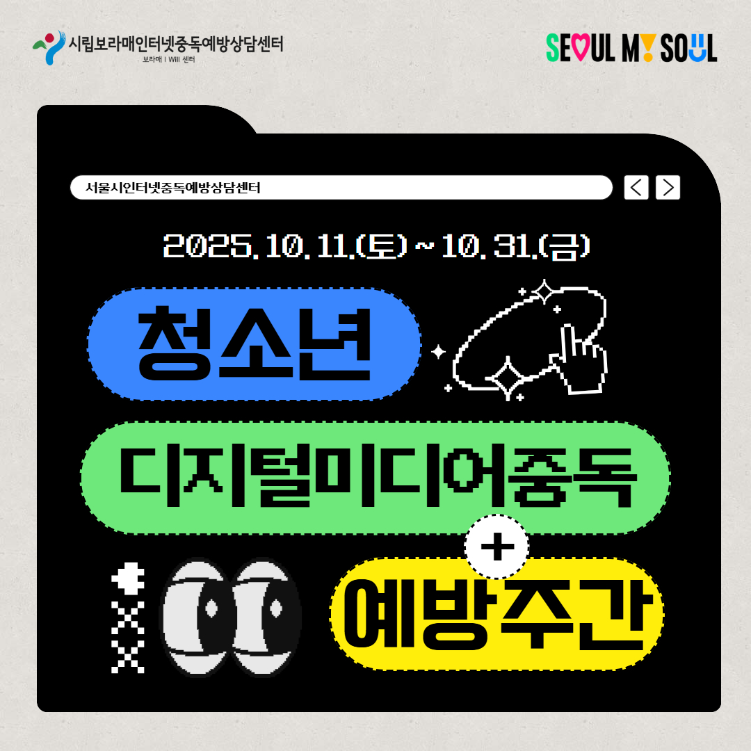 | 2025 ¼¿ï½ÃÀÎÅͳÝÁßµ¶¿¹¹æ»ó´ã¼¾ÅÍ Ã»¼Ò³â µðÁöÅй̵ð¾îÁßµ¶ ¿¹¹æÁÖ°£(10/11~10/31) | |