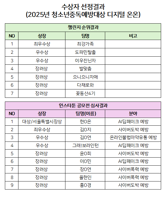 | 2025³â û¼Ò³âÁßµ¶¿¹¹æ´ë»ó µðÁöÅÐ ON,on 縰Áö ¹× °ø¸ðÀü ¼ö»ó ÃÖÁ¾ °á°ú | |