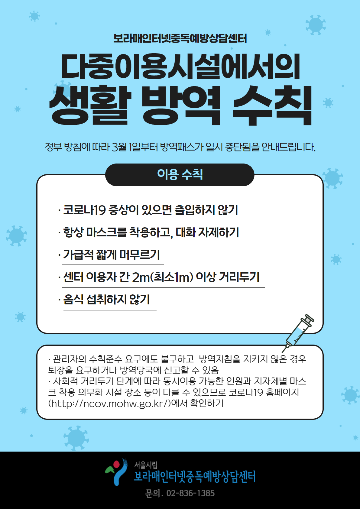 | ´ÙÁßÀÌ¿ë½Ã¼³¿¡¼ÀÇ »ýȰ¹æ¿ª¼öÄ¢ ¾È³»(¹æ¿ªÆÐ½º ÀϽà Áß´Ü 3/1~) | ||