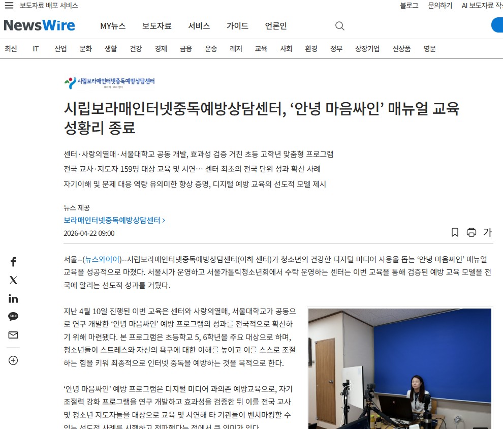 | [º¸µµÀÚ·á] ½Ã¸³º¸¶ó¸ÅÀÎÅͳÝÁßµ¶¿¹¹æ»ó´ã¼¾ÅÍ, ¡®¾È³ç ¸¶À½½ÎÀΡ¯ ¸Å´º¾ó ±³À° ¼ºÈ²¸® Á¾·á | |